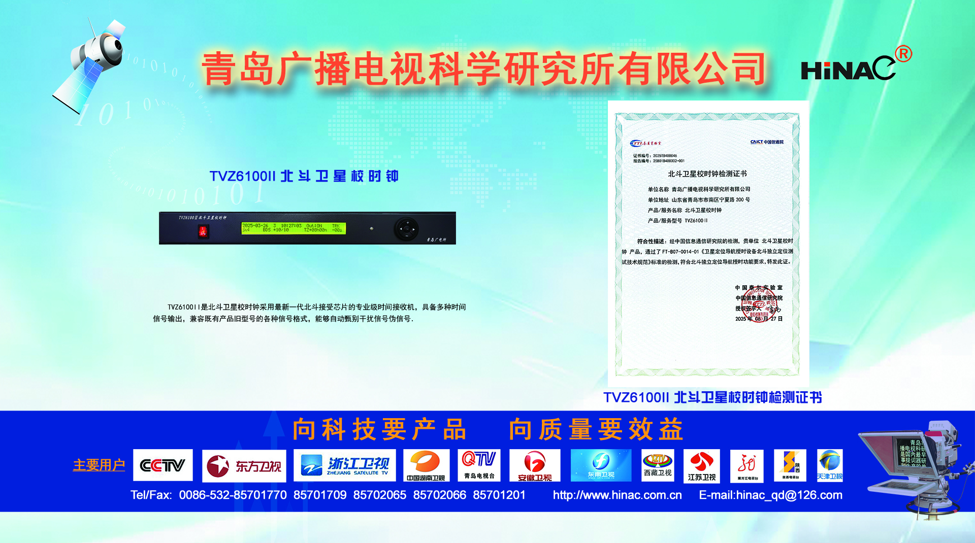 25年不悔的執(zhí)著追求! 25年不懈的專業(yè)堅(jiān)持! 青島廣播電視科學(xué)研究所有限公司(簡(jiǎn)稱青島廣電所)以其對(duì)廣電科技事業(yè)無(wú)限的熱愛(ài),以及為爭(zhēng)做中國(guó)最優(yōu)秀廣電產(chǎn)品供應(yīng)商的美好理想,25年如一日,深耕廣電設(shè)備這塊沃土,已經(jīng)形成且被市場(chǎng)高度認(rèn)可的成果有: TVZ系列GPS/北斗自動(dòng)校時(shí)鐘系統(tǒng) TC系列電視播音提詞器及電視直播系統(tǒng)整體解決方案 TL系列泰麗訊源指示系統(tǒng) QD系列搶答表決評(píng)分系統(tǒng) IC系列廣電一卡通管理系統(tǒng) 同時(shí)向:廣電設(shè)備集成商、地鐵輕軌信號(hào)系統(tǒng)設(shè)備供應(yīng)商及其它業(yè)務(wù)方向創(chuàng)新、拓展、前行! 青島廣電所在國(guó)家廣電傳媒事業(yè)不斷發(fā)展的今天,愿意和您攜手并進(jìn),為我們共同的事業(yè)發(fā)展添磚加瓦開(kāi)拓創(chuàng)新。愿意和您一道,把工作中的一個(gè)奇思妙想轉(zhuǎn)變?yōu)橐豁?xiàng)偉...